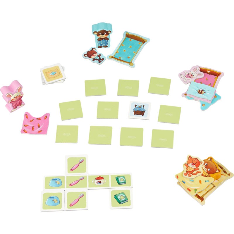 ¡A la cama! es una pequeña colección de 3 juegos de mesa: Dos juegos de clasificación y uno de memoria.