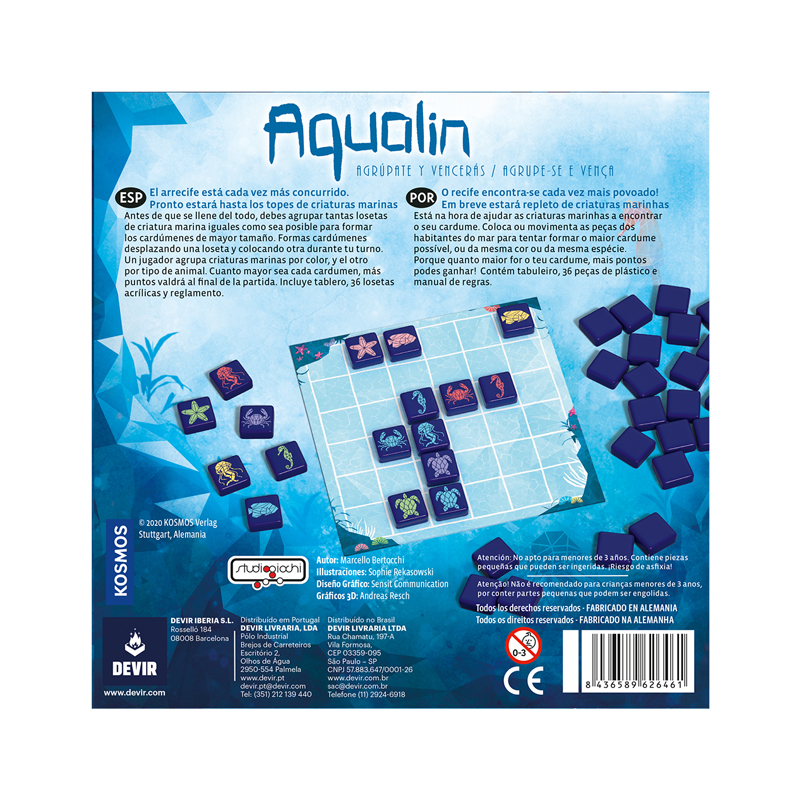 Con los componentes justos, Aqualin ofrece un gran juego y una magnífica experiencia para todo tipo de jugadores. El arrecife donde se desarrolla la acción es un tablero central con 36 casillas, dispuestas en 6 columnas y 6 filas. A su alrededor se disponen las 36 fichas de vida marina, en las que encontramos estrellas de mar, cangrejos, tortugas, medusas, caballitos de mar y peces, todos ellos en distintos colores. ¡No hay dos fichas iguales bajo el agua!