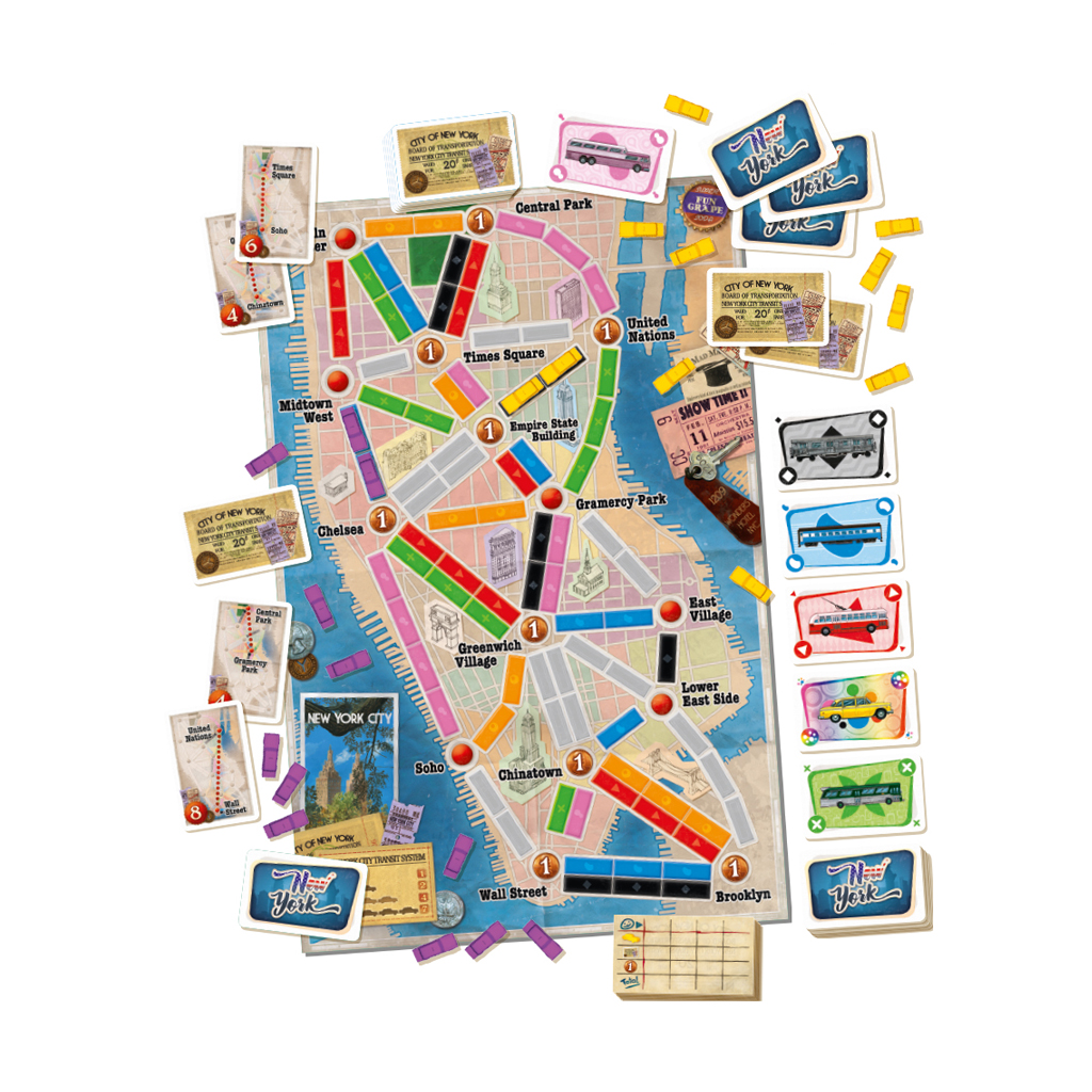 En esta versión de ¡Aventureros al Tren!, los jugadores compiten por las concurridas calles de la ciudad de Nueva York para visitar las atracciones turísticas más prestigiosas y completar sus boletos de destino. Un juego perfecto tanto para principiantes como para jugadores experimentados. ¡Aprende el juego en 3 minutos, juega durante horas!