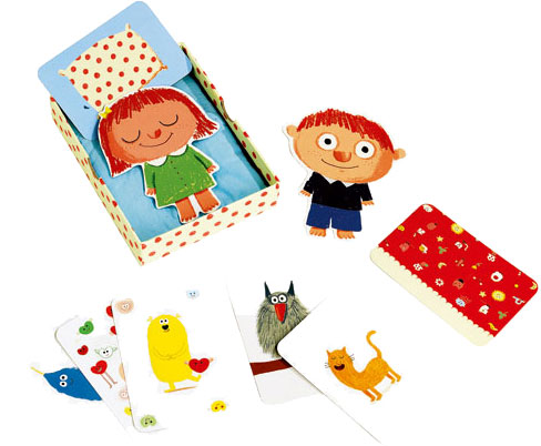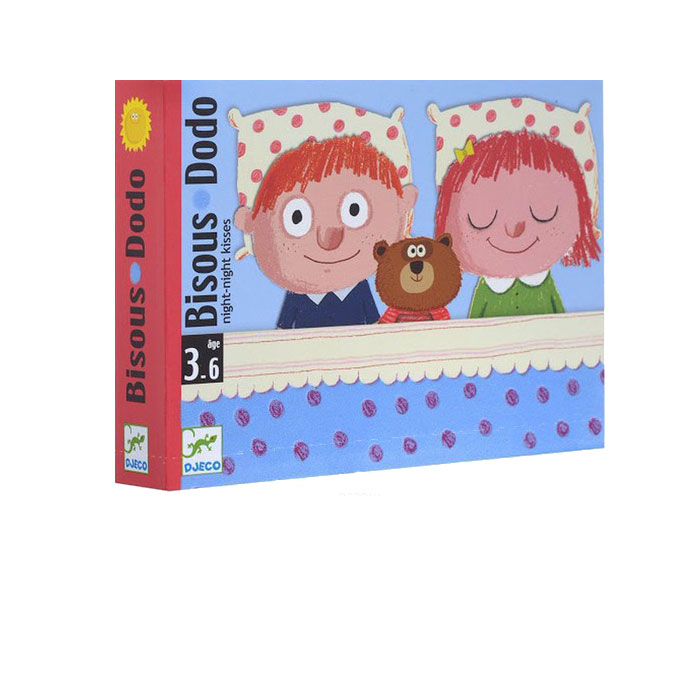 Para jugar a Bisous dodo, pon al personaje con los ojos abiertos sobre su camita y empieza girar las cartas para encontrar los mimos de esta noche, un beso de esquimal, cantar una canción, hacer cosquillas y las cartas sol (que anularán el efecto de los mimos)…