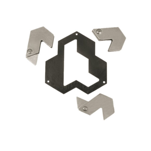 Se compone de un interior con tres piezas y un marco exterior. Uno los desliza dentro del marco y los gira para tratar de sacarlos del marco. De un vistazo, las piezas parecen tener la misma forma, pero el exterior y el interior son diferentes, terminando con tres piezas cuyas formas son diferentes.