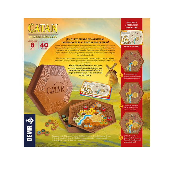 Por primera vez en la saga de juegos Catan, este título no pondrá a prueba nuestra capacidad de negociación o la habilidad para sumar puntos de victoria más rápido que nuestros oponentes. En esta ocasión, Catan nos reta a superar acertijos cada vez más complejos solo con la ayuda de nuestro ingenio. Como si realmente fuéramos uno de los primeros colonos que llegaron a la todavía inexplorada isla de Catan, deberemos abrir rutas comerciales entre bosques y montañas, ríos y desiertos, ciudades y asentamientos.