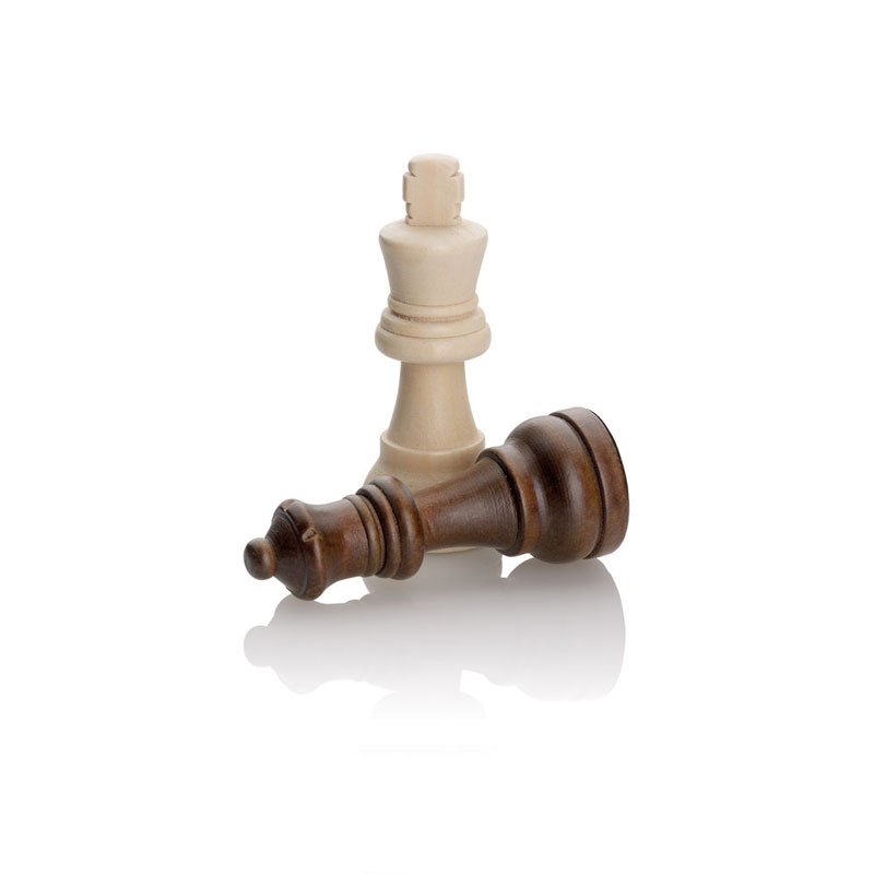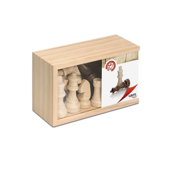 Juego de figuras de ajedrez de madera en una práctica caja transparente.