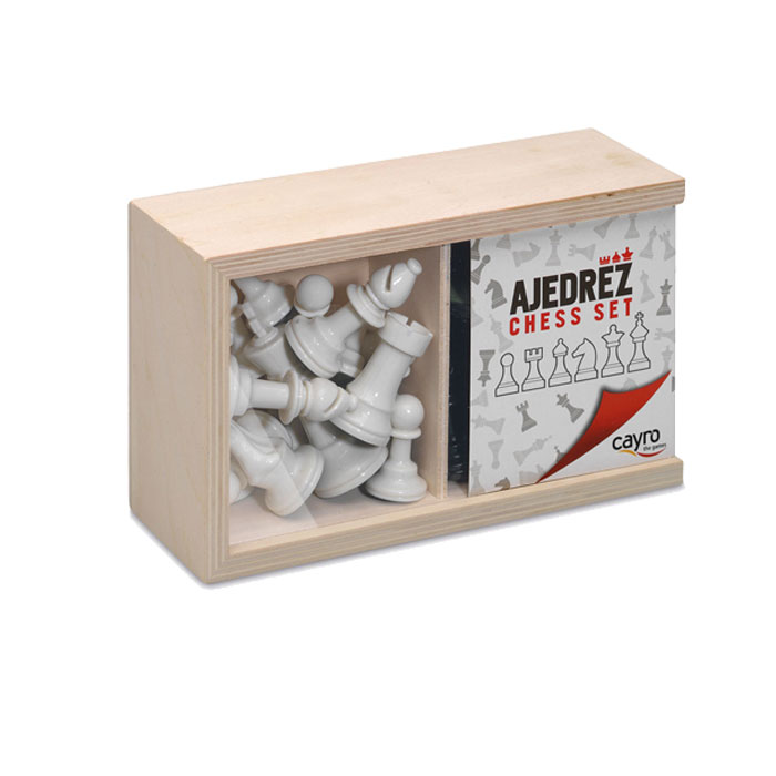 Juego de figuras de ajedrez de plástico en una práctica caja transparente.