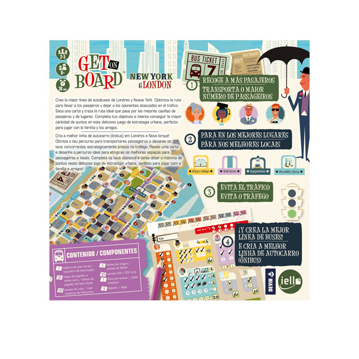 La mecánica principal de Get on board es el flip and write (voltear y escribir) ya que a lo largo de la partida daremos la vuelta a una serie de cartas (billetes de autobús, en el juego) y anotaremos en nuestra hoja personal los encuentros que llevemos a cabo. En función del número de jugadores, se prepara el tablero por la cara de Londres o la de Nueva York. Cada participante toma las fichas de su color… ¡Y que empiece la partida!