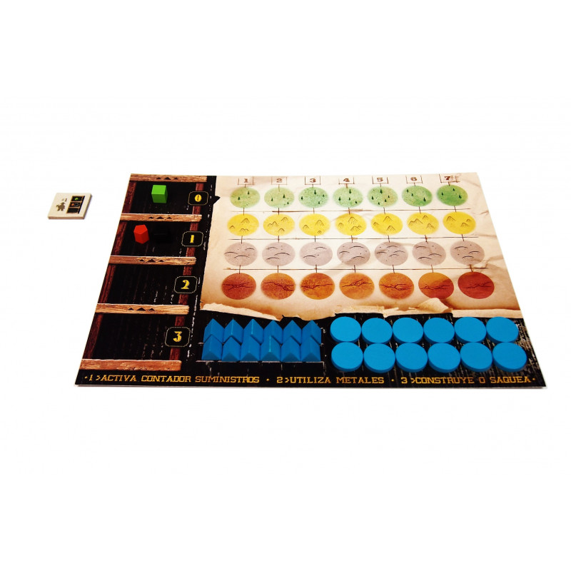 Hay cinco recursos en el juego: los metales Cobre, Plata y Oro se usan para adquirir puntos de victoria de varias maneras, mientras que Madera y Piedra son materiales de construcción que se usan para construir campamentos y asentamientos en el tablero para recolectar más recursos e influencia en el paisaje.
