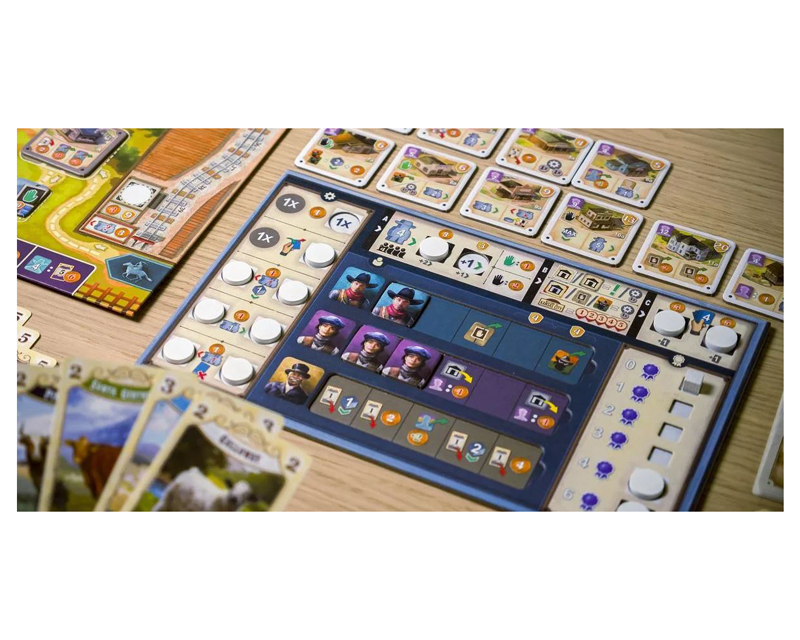 A lo largo de la partida, podrás adquirir cartas de objetivo que te proporcionan poderosas acciones únicas de un solo uso, pero cuidado, aceptar uno de estos encargos supone que, si al final de la partida no has cumplido sus requisitos, perderás puntos de victoria. También tendrás que ir mejorando tu propio tablero de jugador, retirando discos de los espacios que prefieras para potenciar diversas habilidades: podrás desbloquear nuevas acciones auxiliares, mejorar el movimiento de tu vaquero, aumentar tu capacidad máxima de certificados o incrementar tu límite de mano.