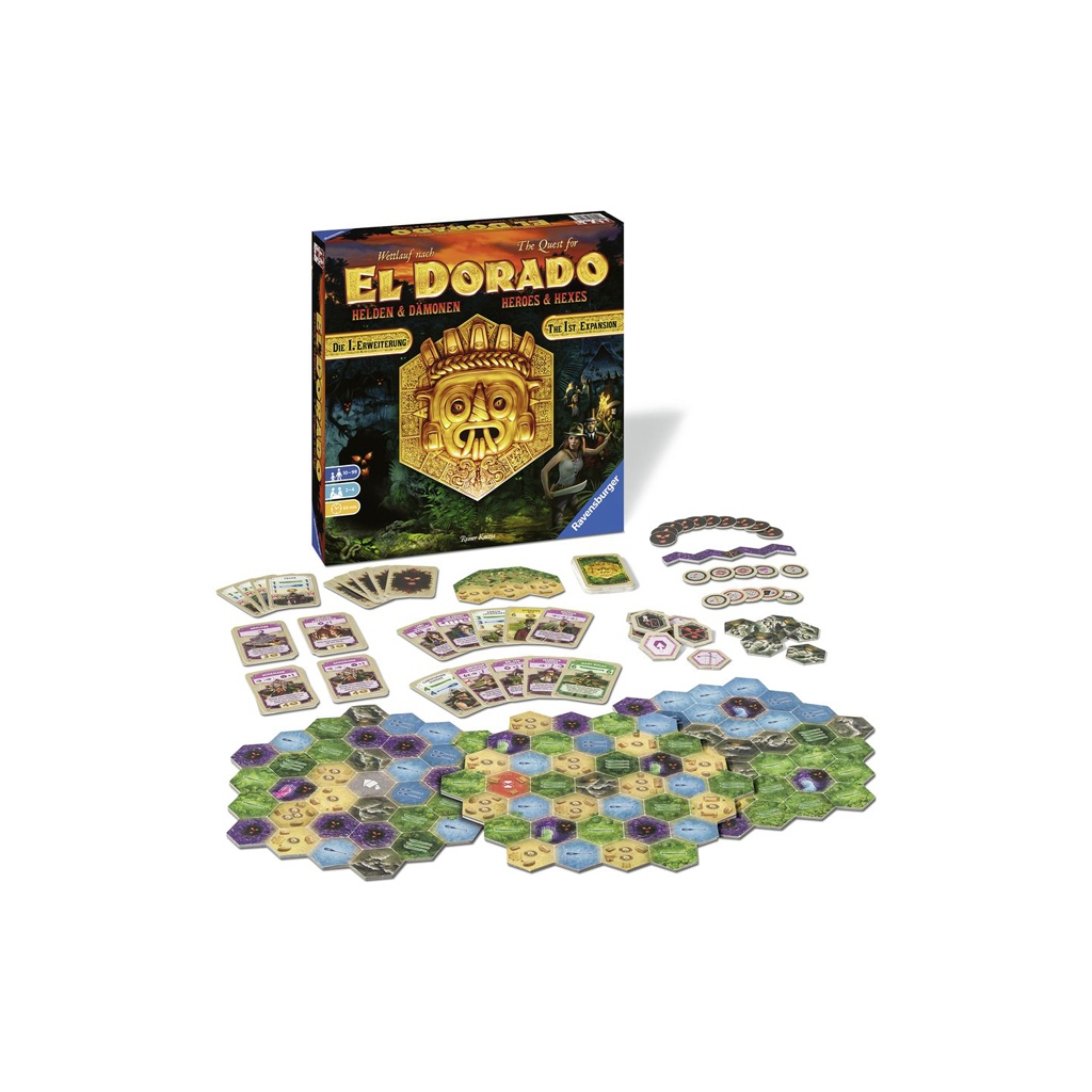 Esta expansión para ‘El Dorado’ incluye tres nuevas losetas de doble cara de terreno que añaden un nuevo elemento al juego: las maldiciones. Cuando un jugador se detiene en un espacio de demonio, debe robar y revelar una ficha de maldición para ver cómo les afectará. Quizás deberán descartar ciertas cartas antes de poder viajar a un tipo de terreno, o quizás el resto de jugadores moverán mientras el jugador maldito está paralizado, o bien puedes verte afectado por un demonio.