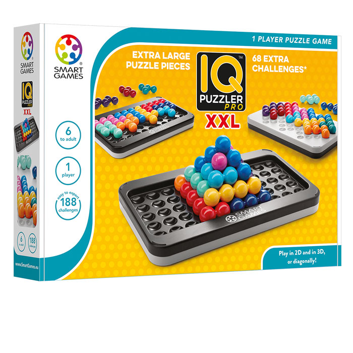El IQ Puzzler Pro XXL es la nueva versión del superventas IQ Puzzler Pro, pero ocho veces más grande. Incluye 68 retos adicionales en 2D, 3D y diagonal, además de los 120 del juego original.