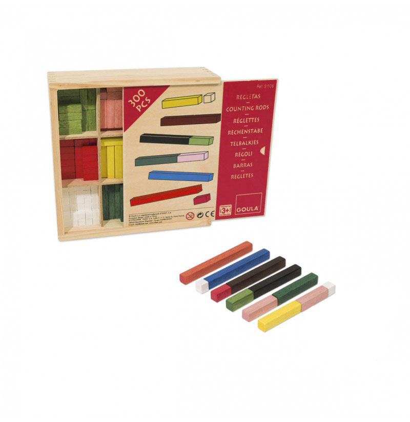 Juego de 300 regletas que ayudan en el proceso de comprensión de los números y operaciones matemáticas básicas.