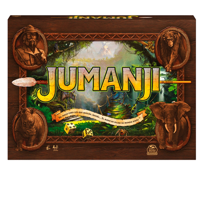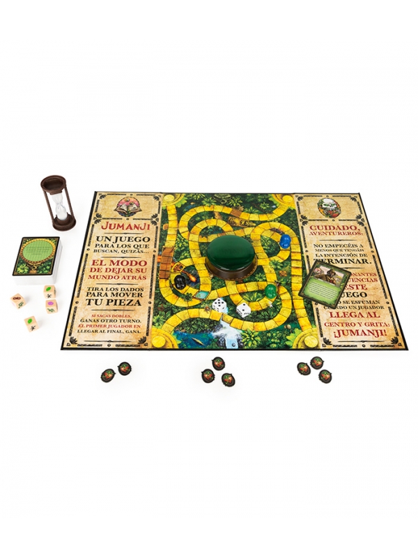 Tú y tu grupo de valientes aventureros os encontráis en lo más profundo de una selva llena de secretos y sorpresas. Los peligros que os aguardan amenazan con arrebataros las 3 valiosas fichas de vida. El objetivo es llegar a Jumanji (el centro) y decir su nombre en voz alta. Pero tened cuidado: si alguien del grupo agota todas las fichas de vida, todos pierden.