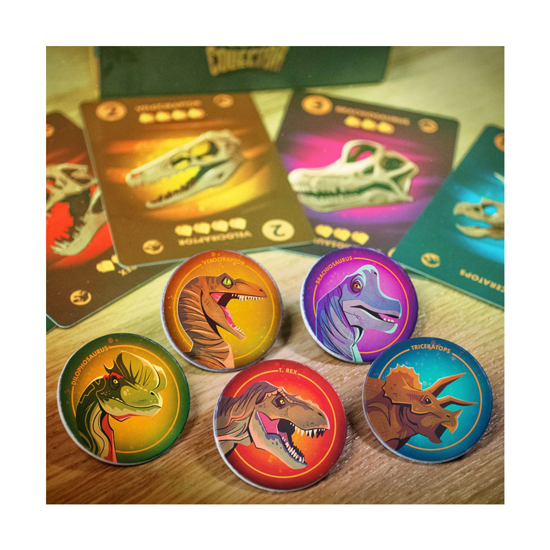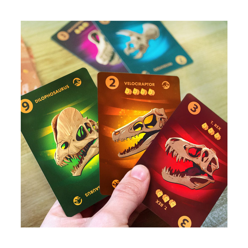 El objetivo del juego es obtener las 5 fichas de dinosaurios diferentes. ¡Sumérgete en el apasionante mundo de la paleontología con este adictivo y divertido juego de cartas! Recoge y combina ADN de dinosaurios, creando un Parque Jurásico único. La competencia es feroz y el objetivo es revivir tantas especies de dinosaurios como sea posible.