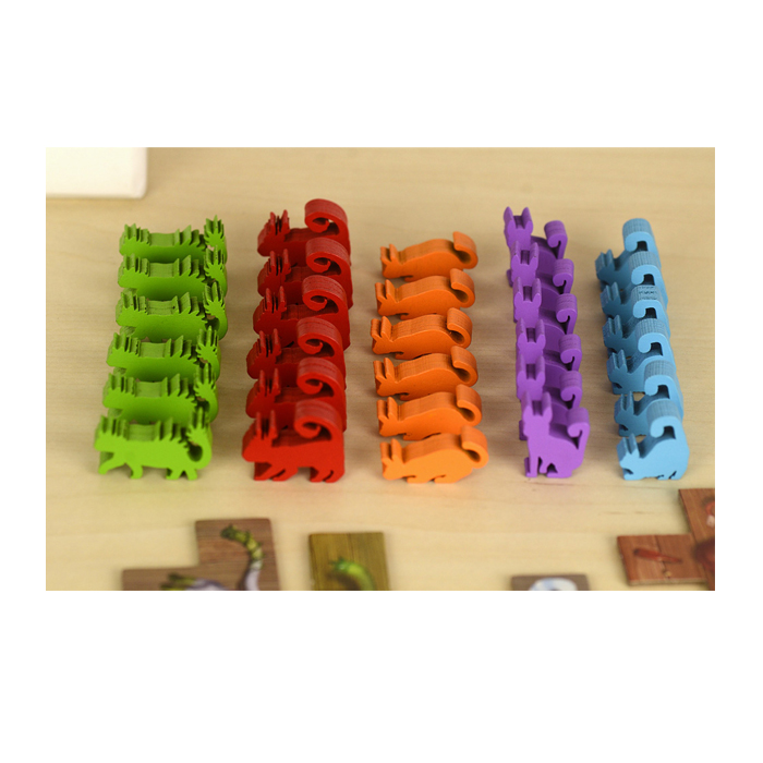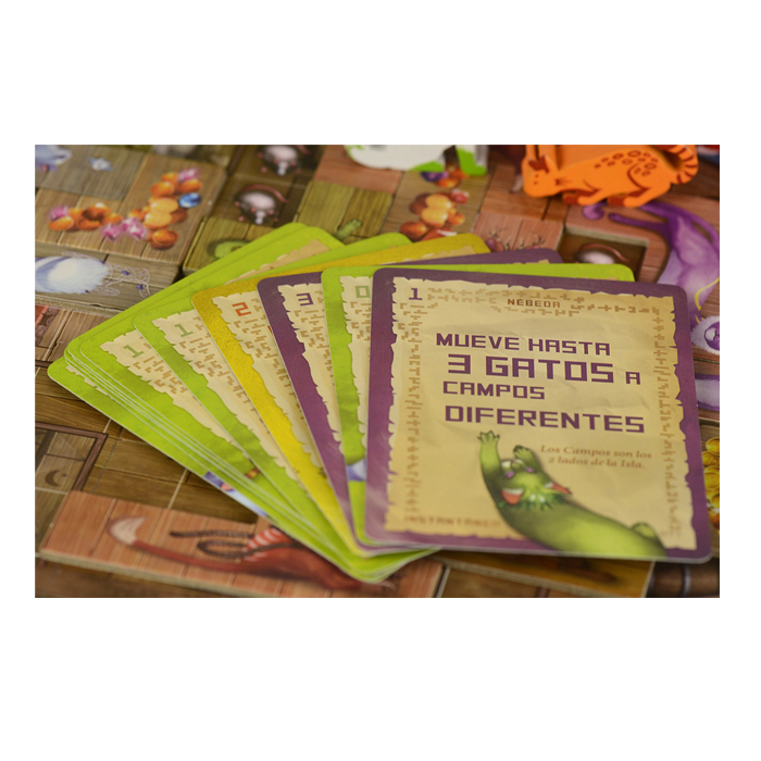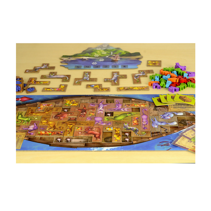 Los Gatos y los Tesoros se representan con losetas de diferentes formas que deberás colocar cuidadosamente en tu barco. Trata de mantener juntas a las familias de Gatos, completa cartas de Manuscrito y deja suficiente espacio para poder seguir colocando cosas en tu barco.