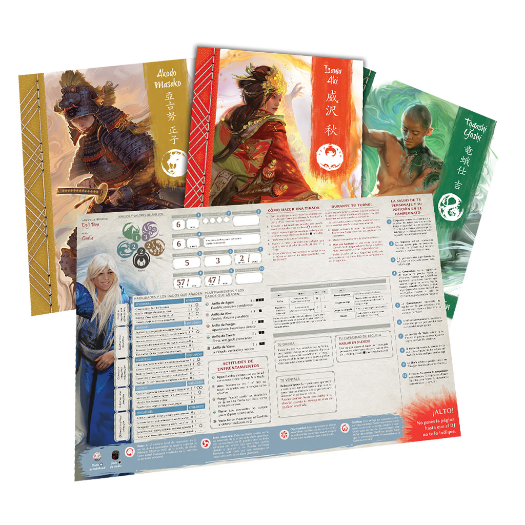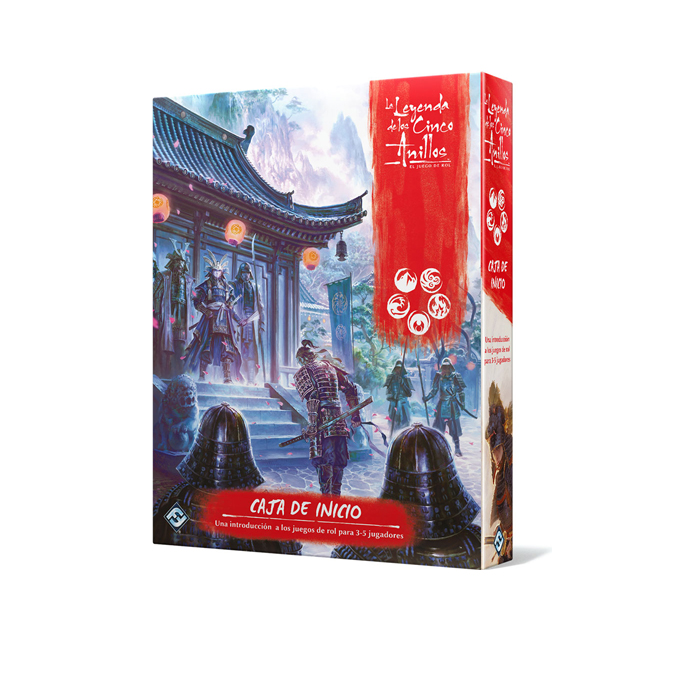 La Caja de Inicio de La Leyenda de los Cinco Anillos contiene una aventura completa que se desarrolla progresivamente para que los jugadores asimilen los fundamentos del sistema de juego sobre la marcha. Los libretos de personajes pregenerados incluyen todas las reglas necesarias para que siempre las tengan al alcance de la mano. Los dados especiales y la apasionante mecánica narrativa convierten cada tirada en un acontecimiento dramático.