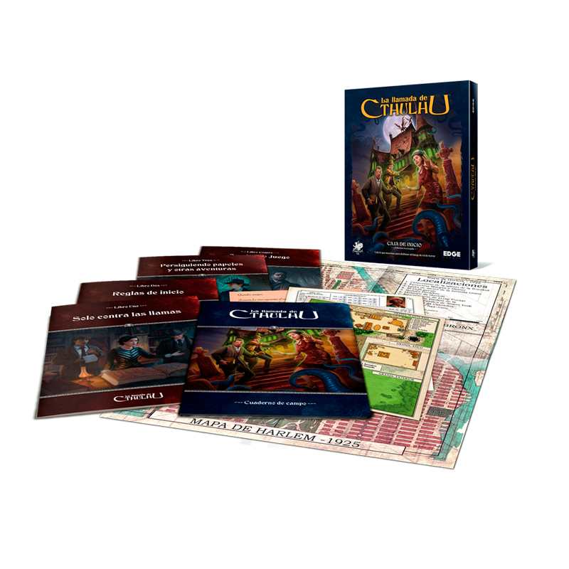 • Un Cuaderno de campo: En su interior encontrarás una selección de investigadores ya creados para usarlos en cualquiera de las aventuras, así como hojas de personaje en blanco. Estas hojas de personaje también las podrás descargar de la página edge-studio.net, ayudas de juego listas para usar y un mapa desplegable de Harlem.