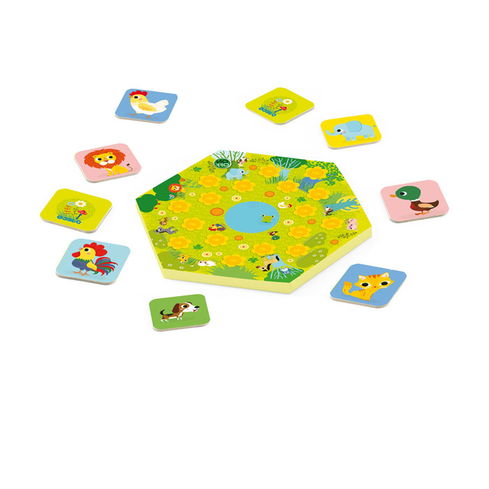El primer jugador da la vuelta a una carta, observa el animal y elige una flor del tablero. La pulsa y se oye un sonido de animal…