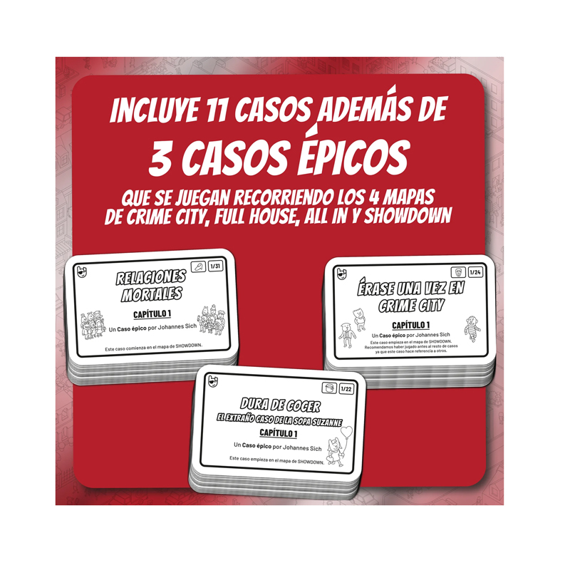 Esta caja contiene 14 casos con un total de 136 cartas. Los tres Casos Épicos están divididos en capítulos que, a su vez, están repartidos por los cuatro mapas de Crime City.