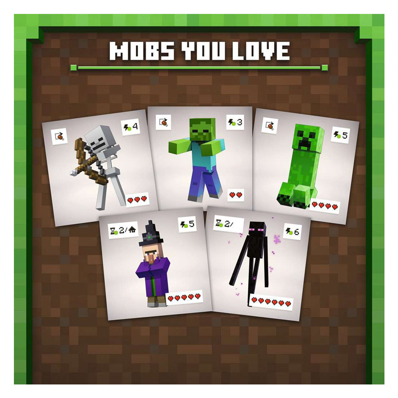 En esta aventura analógica explorarás el mundo pixelado de Minecraft. Con su propio personaje, cada jugador recoge los recursos ladrillo y se defiende luchando contra las criaturas de cada mundo, para crear su dimensión personalizada. Gana el primero que consiga completar su tablero de juego con las fichas-mundo del mismo tipo.