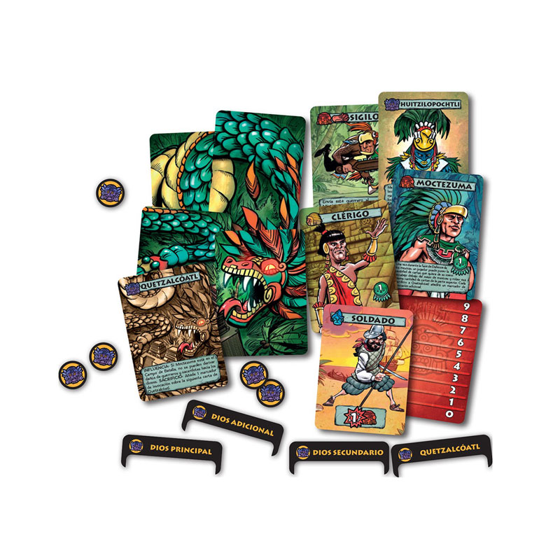 En Moctezuma tendréis que colaborar para mantener la defensa de la ciudad de Tenochtitlan de la invasión extranjera. Las tropas españolas utilizarán todo lo que esté a su alcance para abatir los distintos templos de la ciudad, para así desmoralizar y conquistar a sus habitantes. Por vuestra parte, por un lado tendréis que gestionar vuestras tropas de guerreros y ponerlas al servicio del gran comandante Moctezuma, y por el otro, deberéis saber optimizar el uso de los sacerdotes. Con sus sacrificios e invocaciones podrán reforzar el efecto que los dioses mexica tendrán sobre la mesa de juego. Los dioses juegan un papel fundamental en Moctezuma. Contaremos con diez dioses distintos, cada uno con un poder único que asegurará que el juego tenga una gran variabilidad entre partidas. El más importante siempre será Quetzatcoatl, ya que solo podremos ganar la partida si conseguimos invocar los cuatro aspectos de su poder antes de que la ciudad sea conquistada por los españoles.