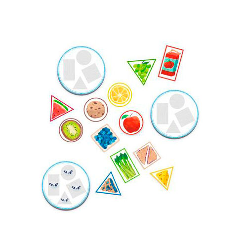 2. Por turnos, saca de uno en uno, los alimentos de la cesta de picnic. ¿Qué forma has cogido?, ¿Qué color tiene? Busca la forma en tu plato y coloca el alimento en su posición.