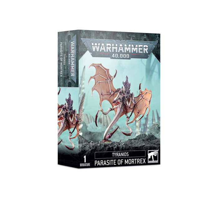 Esta caja monta un Parásito de Mortrex. Esta bestia alada viene armada con extremidades con garras y ovipositor con púas, y es un organismo incubador que alberga cientos de vainas de Devoradores. Dotada de toda una gama de habilidades horripilantes, este biomorfo único añade opciones de disrupción táctica a los ya impredecibles tentáculos de la Flota Enjambre.