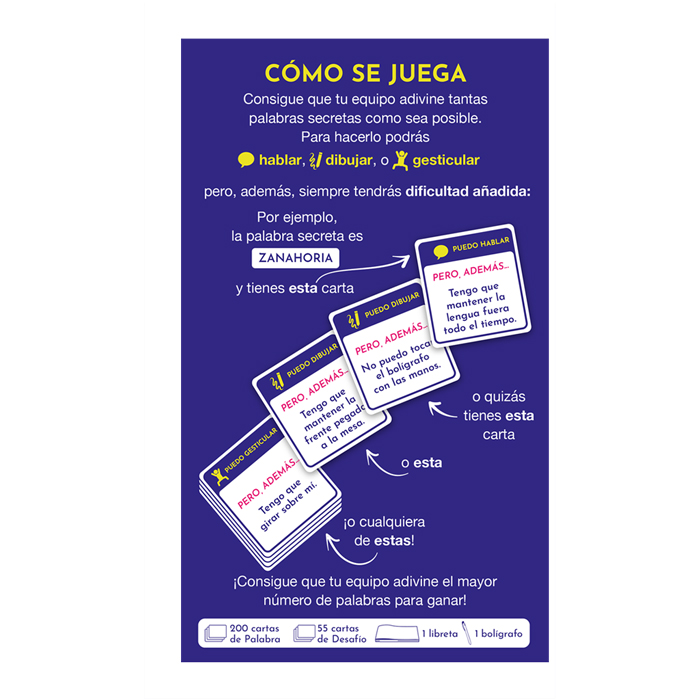 Igual te toca explicar la palabra mientras das vueltas sobre ti mismo o dibujarla sin tocar el bolígrafo con las manos. O puede que durante todo tu turno debas pegar la frente a la mesa. O sacar la lengua como si fueras un carlino distraído. O… ¡Cualquier cosa!