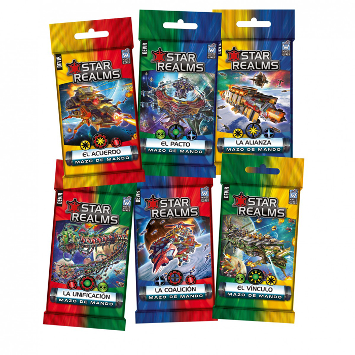 Mazos de Mando es la nueva expansión de Star Realms, el juego de construcción de mazos de batallas espaciales. Esta nueva expansión se conforma por seis sobres distintos. Cada uno de ellos incluye un mazo inicial único, con cartas de dos facciones, que sustituirá tu mazo inicial estándar dando mayor variabilidad a tus partidas de Star Realms.