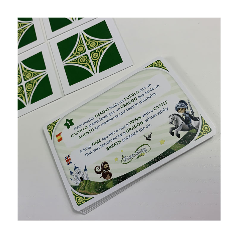 En Storytelling los jugadores elegirán uno de los cuatro cuentos. Uno de los jugadores tomará el papel de cuentacuentos y leyendo las cartas irá contando el cuento. Cada jugador, tendrá que encontrar las losetas de las ilustraciones que corresponden al fragmento del cuento que ha leído el Cuentacuentos. Si encuentra las ilustraciones que se han dicho y en el orden correcto, el jugador ganará la carta. Las losetas descubiertas, se vuelven a tapar para ser localizadas de nuevo en otro capítulo del cuento. Así que deberéis hacer un buen uso de la memoria y recordar las ilustraciones que se han ido descubriendo!