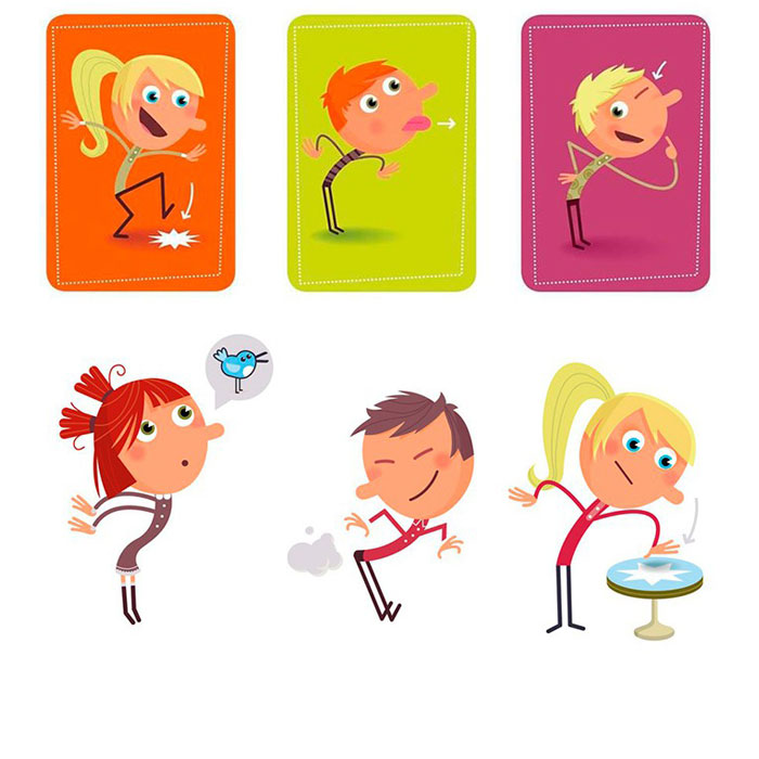 El siguiente jugador coge otra carta pero esta vez debe realizar la mímica o sonido del jugador anterior y la suya y así sucesivamente de modo que se van acumulando acciones para trabajar la memoria.