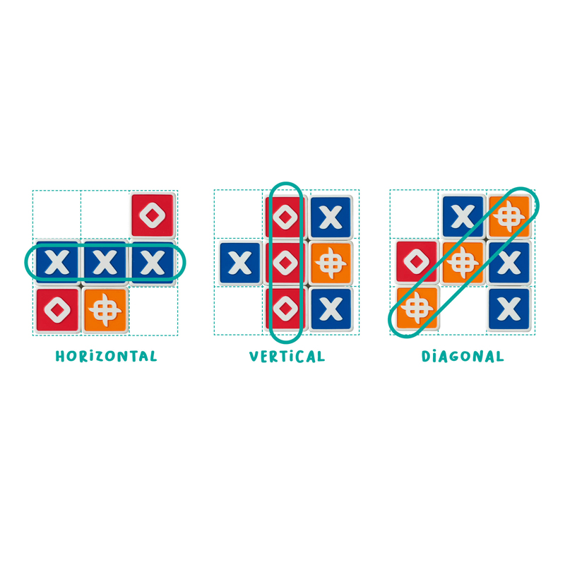 En tu turno, añade una ficha en la zona de juego e intenta crear una línea de 3 símbolos idénticos en vertical, horizontal o diagonal. ¡Si lo consigues te llevarás las piezas!
