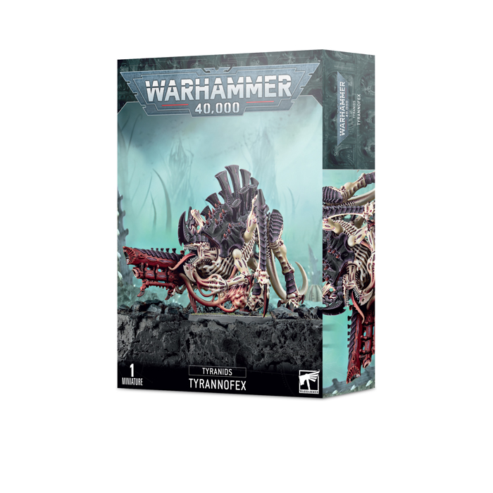 El Tiranofex muestra todo el poder terrorífico típico de los Tiránidos, y es una inclusión asombrosamente siniestra para cualquier colección de Tiránidos. A cuatro patas, dos de las cuales son pezuñas y las otras dos en forma de flecha afilada, esta criatura tiene un caparazón exterior y una larga cola quitinosa y segmentada. Su parte inferior no es menos espantosa, pues puede albergar un perforacarnes o un cañón quebrantador.
